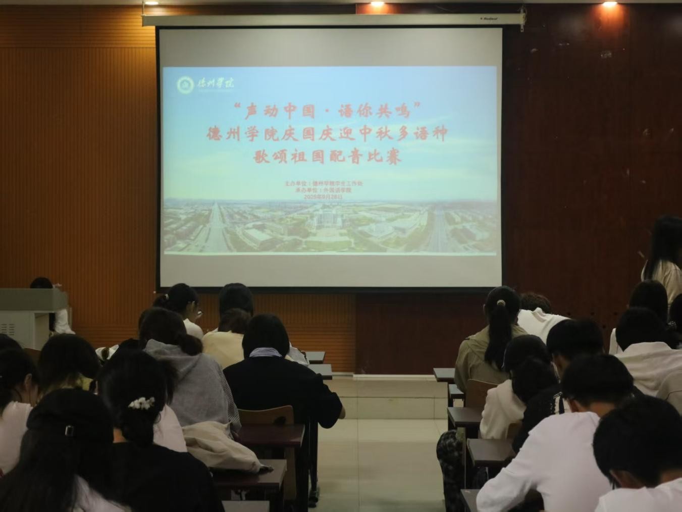 为庆祝中华人民共和国成立76周年、迎接中秋佳节,进一步推进校园文化建设,激发学生爱国热情与语言学习兴趣。9月28日,由学生工作处主办、抖音tv电视版app最新承办的“声动中国 语你共鸣”庆国庆迎中秋多语种歌颂祖国配音比赛在博文楼328举行。本次比赛以多语种配音为核心形式,设置 “主题配音” 和 “即兴配音” 两个环节,全面考察选手语言驾驭、情感表达及临场应变能力。在主题配音环节中,选手们运用汉、英、日、俄等多语种,演绎...