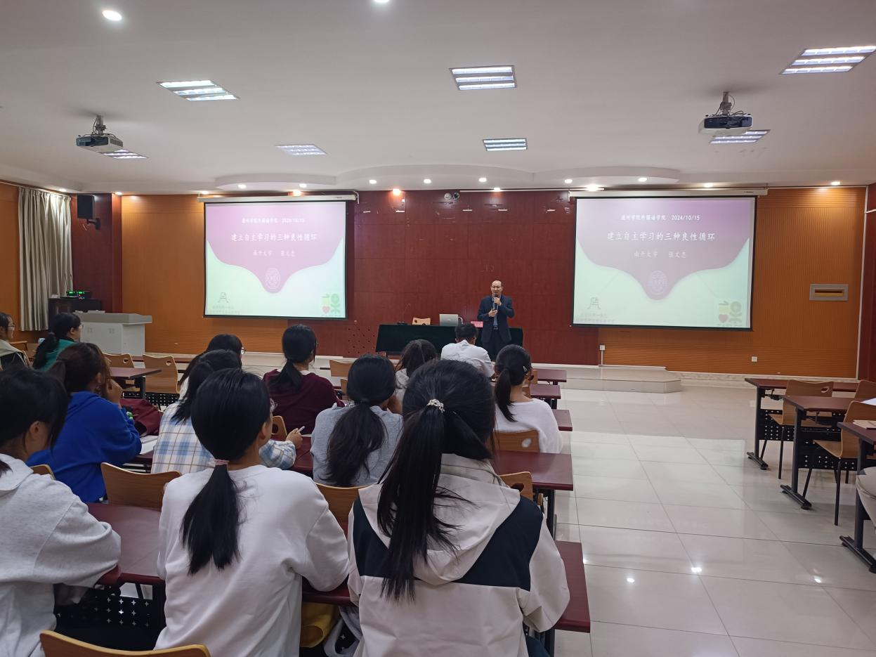 10 月 15 日上午,张文忠教授在博文楼328为抖音tv电视版app最新学生做了以“建立自主学习的三种良性循环” 为主题的讲座。他首先强调了大学期间提升自主学习能力的重要性,然后详细介绍了目标-动力良性循环、师-生互动良性循环和内外效用良性循环,并通过分享个人大学阶段英语学习经历向同学们展示了如何实现自主学习的三种良性循环。最后,张教授寄语同学们与教师共同努力,构建促进其自主学习的生态环境。讲座提升了学生们对自主学习的意识,引导学生了解了个性化学习方法,为学生们开启了新的学习之门。