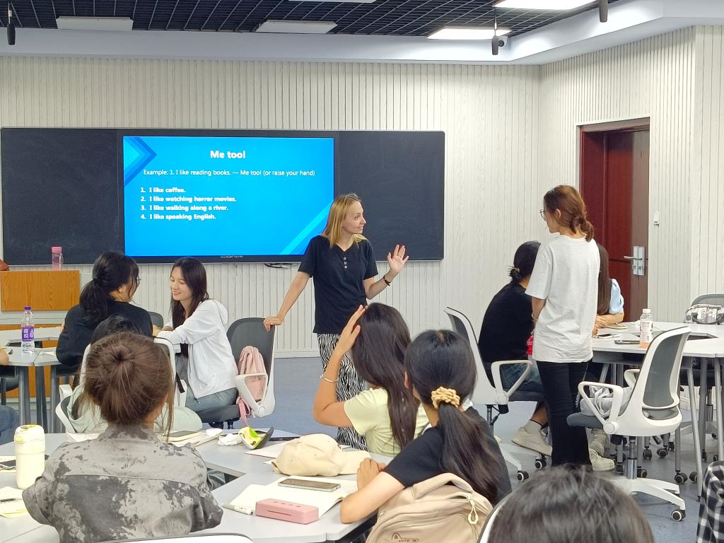 活动中,外教老师以其独特的魅力和专业的素养,引领新生们穿梭于语言的海洋。活动从“Know yourself”开始,塔吉杨娜老师鼓励大家站上讲台进行自我介绍。自我介绍之后,老师讲述了来自不同国家的文化趣闻,还通过互动环节的“英语接龙”活动,激发了新生们对英语学习的浓厚兴趣。