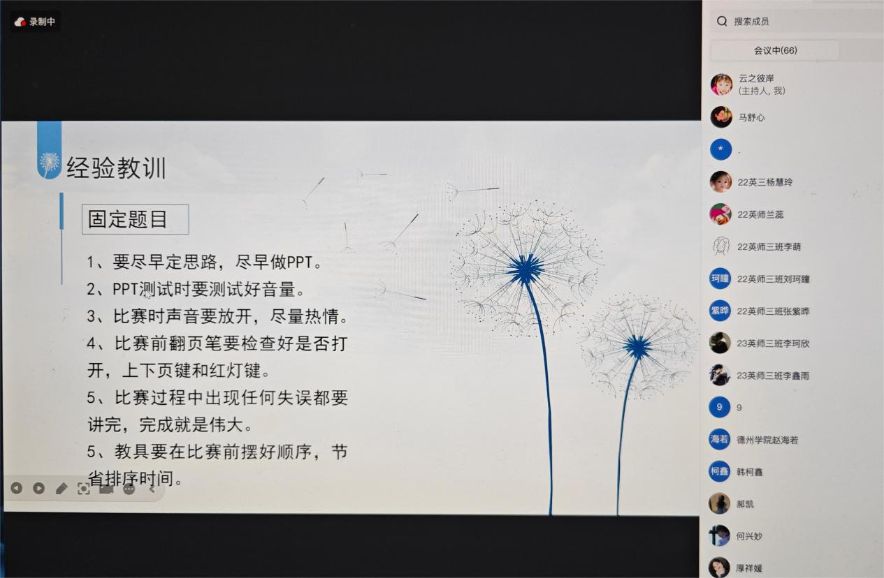 为激励更多师范生积极投身教育教学实践,提升专业技能和综合素质,7月26日,外国语学院在线上举办了第十二届山东省师范类高校学生从业技能大赛获奖选手经验交流会。大赛中获奖的三位选手向22级、23级英语(师范)专业的学弟学妹们分享了自己的参赛经历和心得体会。她们分别从比赛准备、比赛过程、心态调整等方面进行了深入剖析,为同学们提供了宝贵的经验和建议。
