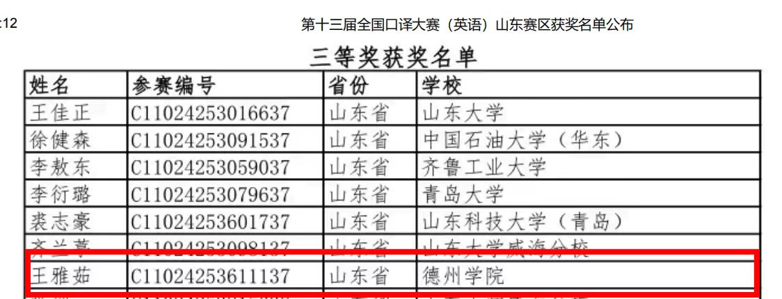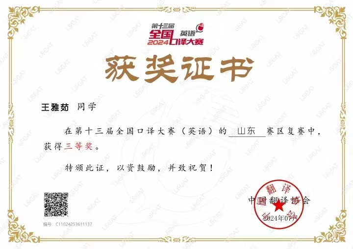 近日,中国翻译协会、中国翻译研究院举办第十三届全国口译大赛(英语),陈陵娣老师指导的王雅茹同学在山东赛区中获得三等奖。