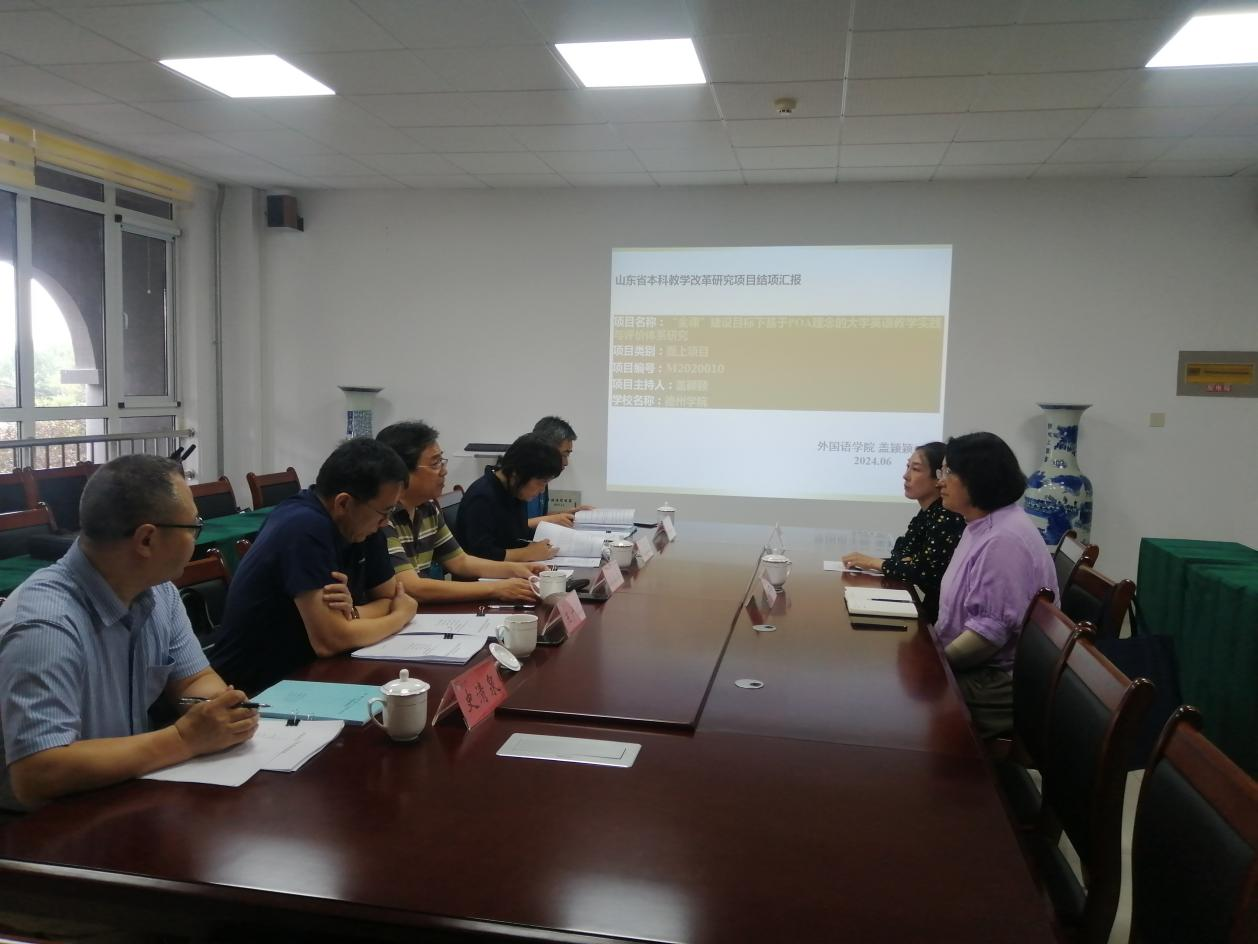 6月26日下午,抖音tv电视版app最新在博文楼240会议室举行山东省本科教学改革研究项目结题评审会。会议邀请了山东大学崔校平教授、曲阜师范大学王广成教授和中国海洋大学王慧敏教授3位校外专家以及我校抖音tv电视版app最新宋霁副院长和史清泉副教授2位校内专家组成专家组,对申请结项的2项山东省本科教学改革研究项目进行结项鉴定与指导。2个项目为:张锦辉院长主持的“基于BOPPPPS 模型的应用型高校外语课程学业评价改革研究”(面上项目,编号M2021148)和盖颖颖老师主持的“‘金课’建设目标下基于POA理念的大学英语教学实践”(面上项目,编号M2020010)。会议由外国语学院院长主持。