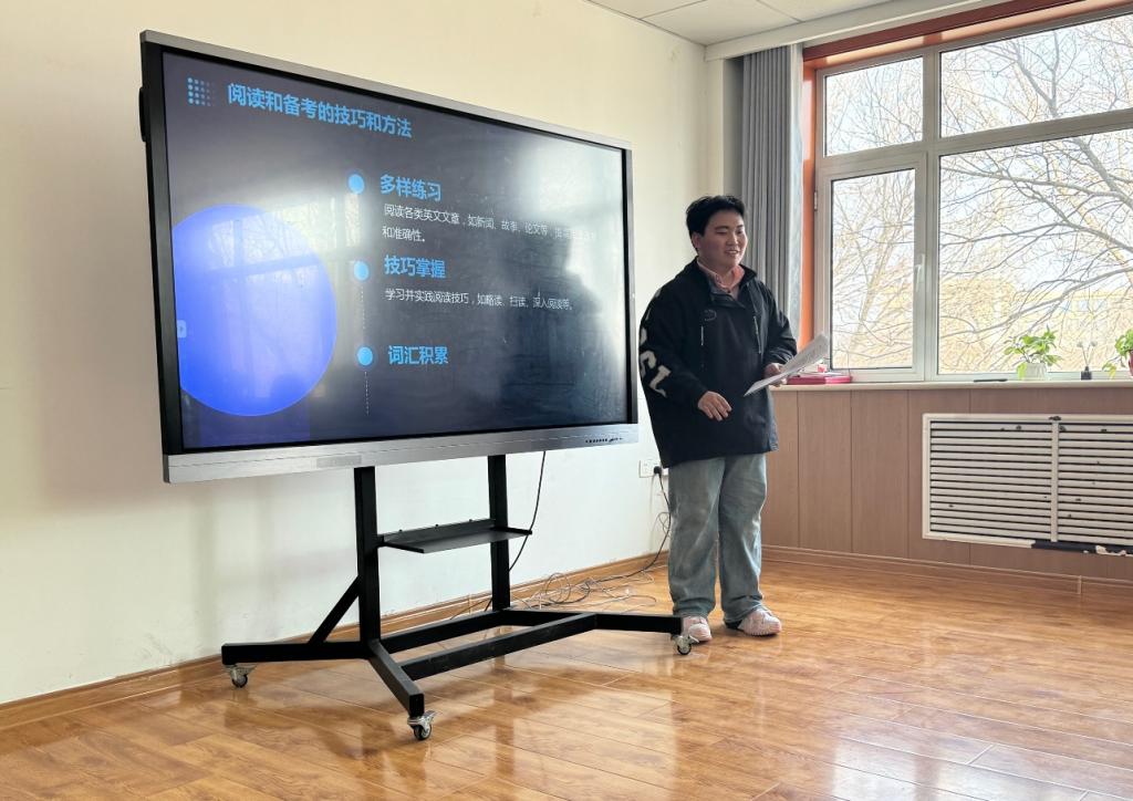 经验交流分享会中,我院英语师范专业2022级孟光冉结合自身备考四级的过程,分析了四级考试内容、时间分配以及听力、阅读和写作等方面的考试技巧,结合真题范例对不同题型给出了针对性的分析指导和建议,并且为同学们推荐了许多学习软件和提高答题准确率的方法,鼓励同学们平稳心态、树立信心、努力复习、认真备考,考出自己的理想成绩。