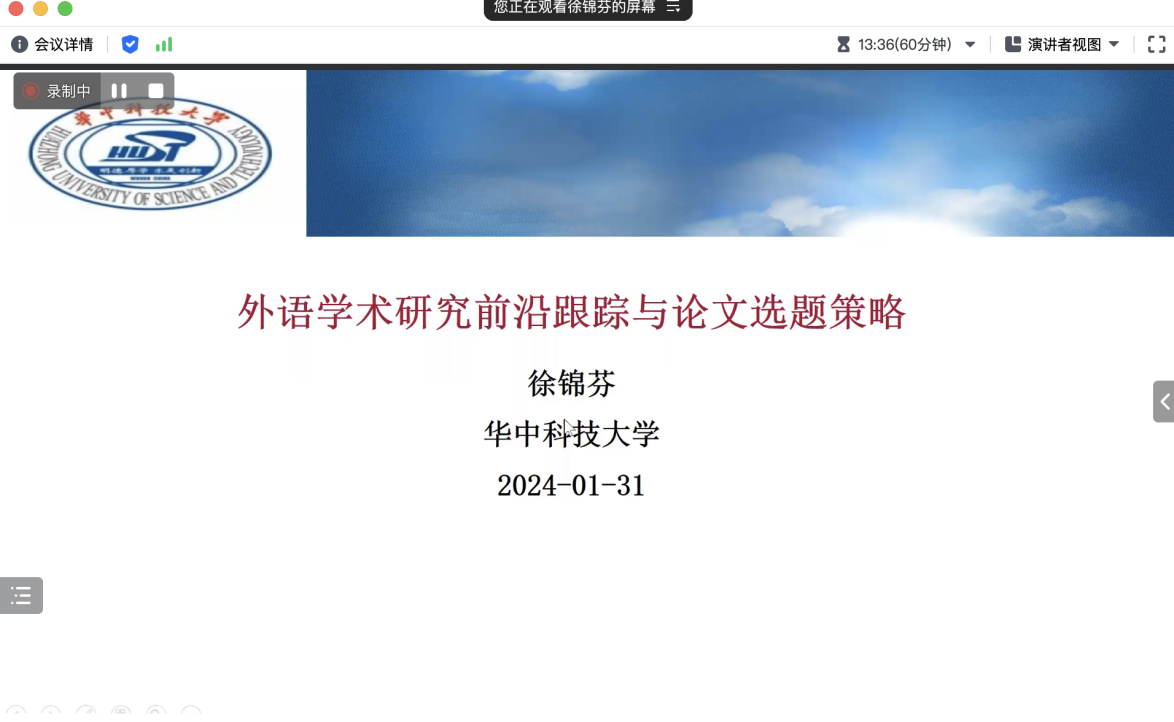 2024年1月31日上午,抖音tv电视版app最新邀请华中科技大学徐锦芬教授做了题为“外语学术研究前沿跟踪与论文选题策略”专题讲座。讲座通过腾讯会议线上进行,会议由抖音tv电视版app最新主要负责人主持,抖音tv电视版app最新教师全程参加。