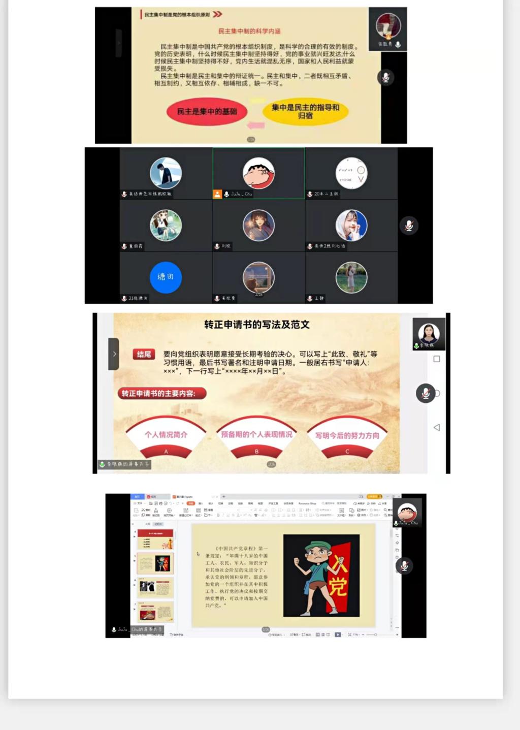 朱馨馨老师以“明确标准,申请入党”为主题向同学们详细介绍了入党流程以及推选团员为入党积极分子的条件,例如:必须年满十八周岁才能提交入党申请书,并在一个月内由谈话人进行思想谈话,入党积极分子的推选过程必须公平公正等等。同时为各位入党积极分子阐释了中国共产党不是单个党员的简单组合,而是根据党的纲领和章程,按照党的民主集中制原则组织起来的统一整体,与广大入党积极分子展开了热烈讨论。