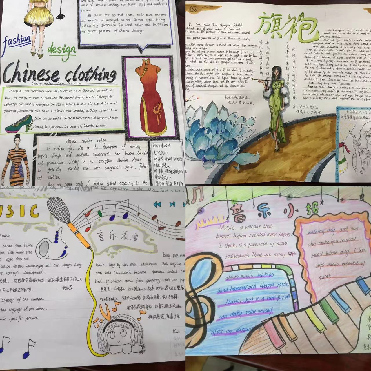 以课程育人效果为旨归。结合单元学习主题,同学们积极搜集资料,展示自己的学习成果。如讲解课文High Mountains and Flowing Water,教师引导音乐专业学生不仅要体会音乐的共情作用,还要懂得无论是网上交友还是传统的交友方式,真正的朋友是始于性情,忠于人品,久于真心。在学习课文Chinese Chi-pao和Art for everyone时,服装专业学生通过画作展示旗袍的发展进化,美术专业学生通过京剧脸谱推介中国国粹。总之,学生利用自己的专业特长将所学英语知识展现出来,增强了学习英语的信心,增加了文化自信。同时,教师的引导还帮助学生体会到了中西艺术形式的不同,并且明白无论中西,只有大众的、人民的艺术才能传承,才有生命力。