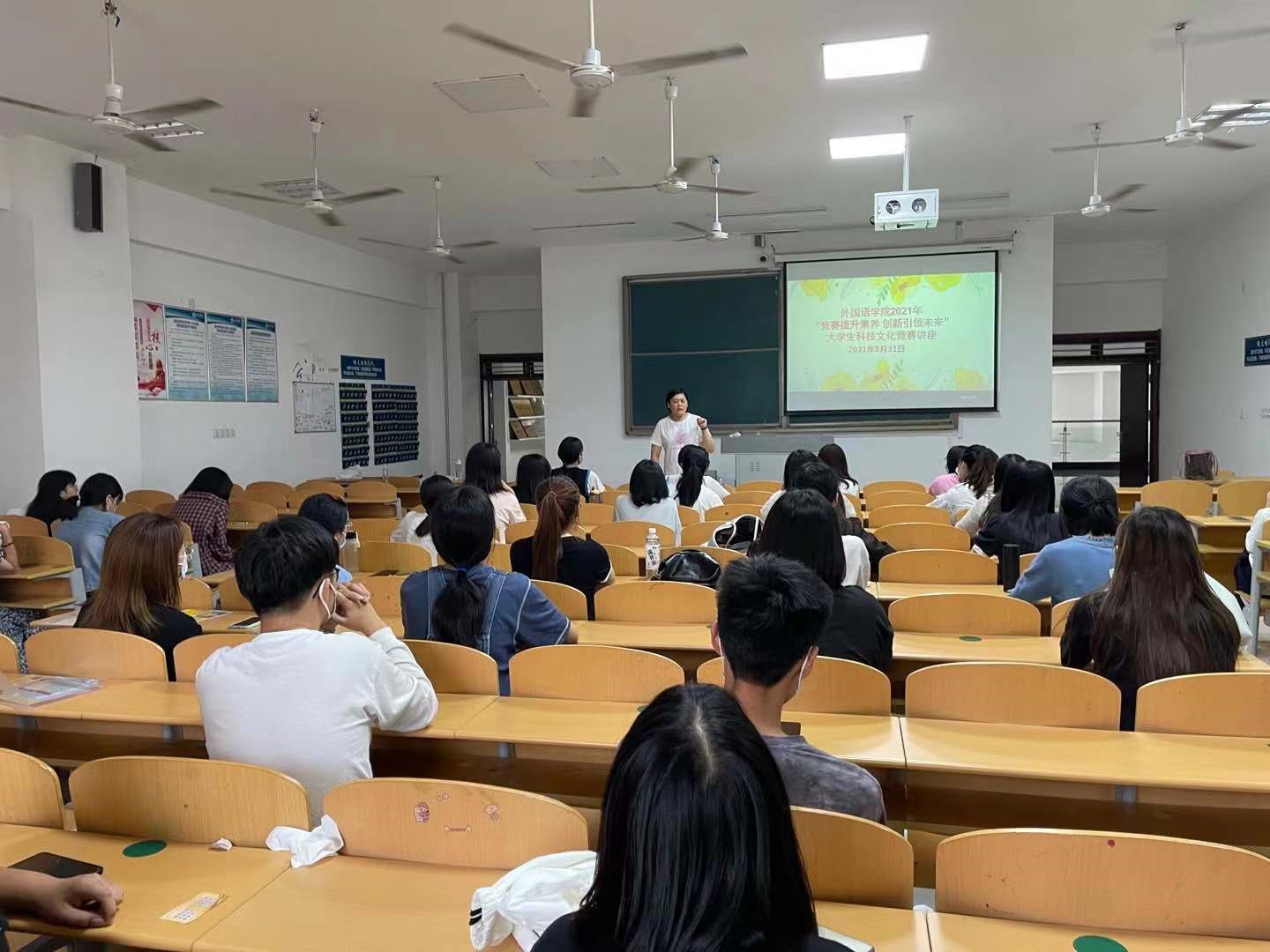 为贯彻落实学校“三位一体”的创新创业教育体系,有力推动抖音tv电视版app最新创新创业工作和大学生科技文化竞赛工作,更好地培养创新型应用型人才,为2021级新生提供了解竞赛,认识创新的平台,我院于8月31日下午在博文楼225教室组织举办了“竞赛提升素养 创新引领未来”大学生科技文化竞赛讲座。外院各专业的学生代表以及来自其他学院的共60余名同学参加了本次讲座。抖音tv电视版app最新贺昱副书记主持活动并作开场讲座,盖颖颖老师和杨康平老师分别进行讲座报告。