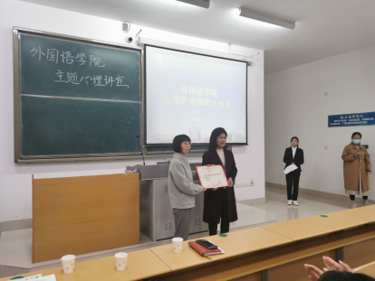 首先,由抖音tv电视版app最新李想书记颁发聘书,特聘刘筠副教授为抖音tv电视版app最新心理咨询师,并向同学们进行了说明介绍。刘筠副教授,女,国家二级心理咨询师,山东省心理学会会员。1992年7月毕业于青岛大学医学院临床医学专业,主要担任《大学生心理健康教育》《护理心理学》《生理学》《成长之道》等课程的教学工作;在德州学院大学生心理健康中心兼职心理辅导老师;2016年应邀参加山东省及德州市青春健康师资培训项目,并荣获山东省青春健康优秀师资称号。其次,刘筠副教授为抖音tv电视版app最新新生开展讲座活动。讲座上,刘筠副教授以两个游戏引入,分享自身经历,引起了同学们浓厚的学习兴趣,现场气氛轻松。同时,刘教授从压力、动力、情绪和爱的方面,引导同学们思考,学会如何做自己的第一责任人。最后,刘副教授通过几则小故事向同学们说明,面对现实的压力,要看清自己、接纳自己,最重要的是学会爱自己。讲座在李晓燕老师的总结中落下帷幕。