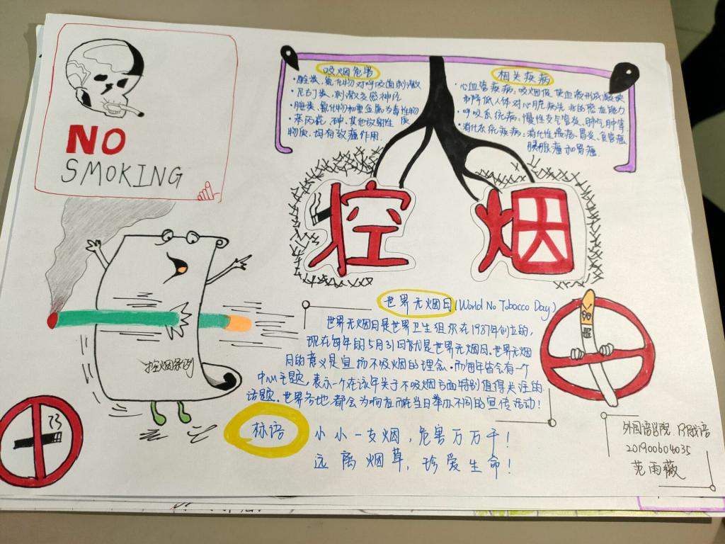 本次比赛采用手抄报的形式,在比赛中选手们的作品构图新颖,版面美观,内容丰富多彩,字迹工整,寓意深刻。选手们用精妙绝伦的绘画,简洁工整的文字展现对校园禁烟的支持,也让同学们对吸烟的危害和禁烟的必要性有了更深一步的认识,唤起控制烟草危害的责任感,营造健康的校园环境,建设无烟校园。最终,评委们通过对选手作品的版图,内容,书写等方面进行评分,最终评选出一、二、三等奖。