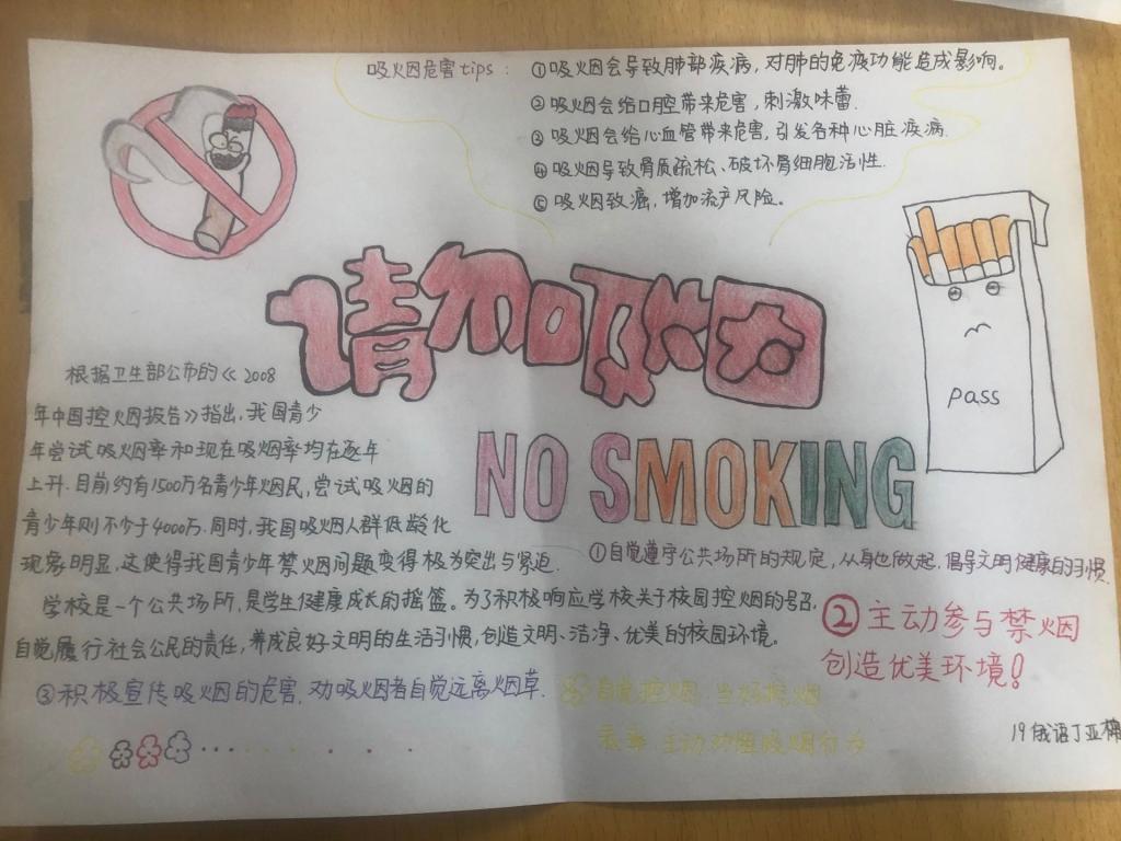 为提升我院学生的禁烟意识,我院举行了“拒吸第一支烟,做不吸烟新一代”手抄报比赛。本次活动旨在让学生意识到吸烟的危害,进而能够做到远离香烟,营造出清新,健康的校园环境。