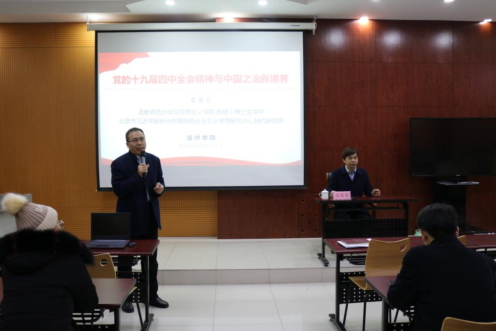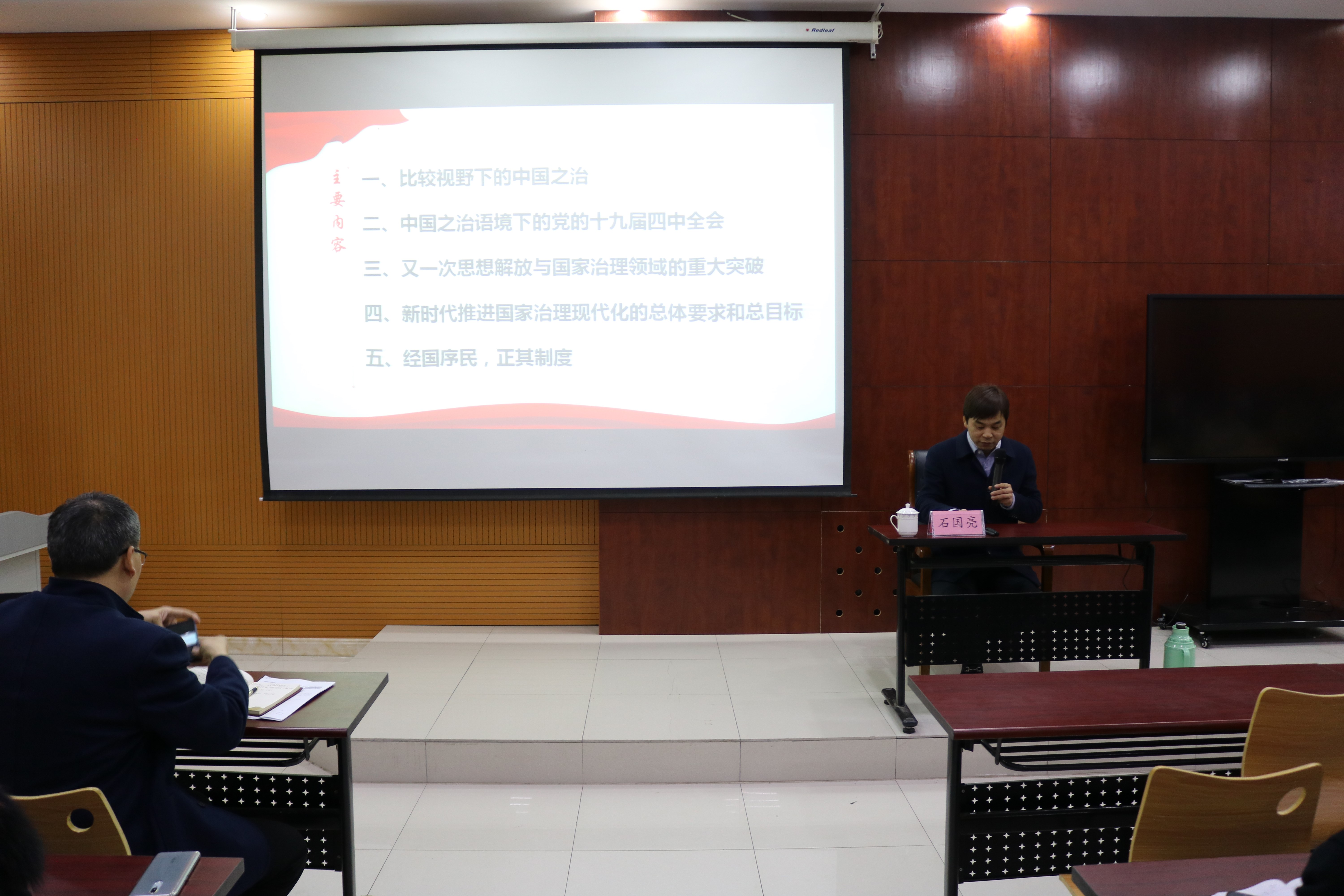 12月13日我院在博文楼347组织学生参加了党的十九届四中全会解析讲座,同时参加讲座的还有我校抖音tv电视版app最新、马克思主义学院的在校学生与老师,以及特邀嘉宾石国亮教授。