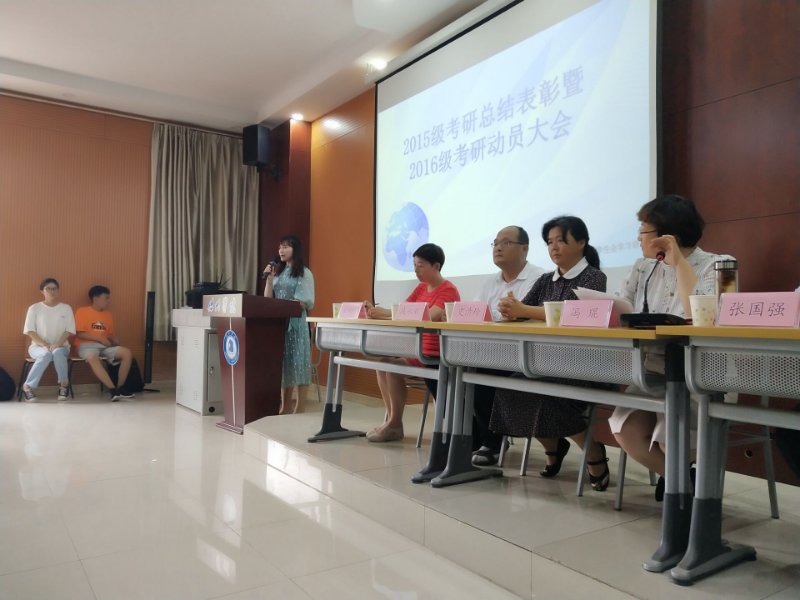会上,副院长崔静静总结了2019年的考研工作,取得成绩和存在的不足,宣读了2015级考研录取学生名单,并对考研现状进行分析,宣布了考研导师名单及考研导师职责。崔院长鼓励2016级考研学生要信念笃定,学习有恒心,有坚忍不拔的毅力,坚持不懈,把外院的优良传统发扬下去。考研导师孙宪梅老师作为导师代表发言,鼓励大家攻坚克难,勇于挑战,说明专业课的复习特点和应试技巧。接下来15级研究生代表马春雨在会上分享了自己的考研心得,并就自己考研过程中的方方面面进行分析总结,为同学们传授宝贵经验。她提出,考研复习期间不宜过分紧张,要积极乐观应对考试。2016级学生刘蔓蔓代表2016级考研学子宣誓,大家将抱着必胜的决心应对考试。接着,我院领导和老师们为15级研究生拟录学生取进行颁奖,并进行合影留念。最后,院长张国强、党总支书记冯琨分别作了总结,希望大家通过榜样的激励、老师的帮助、自己的勤奋,在今后的学习工作中取得新的更大的成绩。他们指出考研之路坎坷崎岖,希望同学们要一步一个脚印的走好自己的人生路。