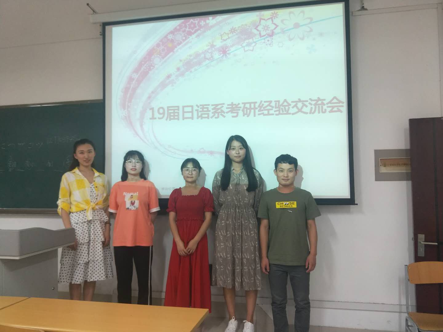 为加强学生对考研知识和经验的了解,营造积极向上的学风,为日语系正在备考的同学加油鼓劲。5月30日晚,我系在博文楼227教室举行了考研交流活动。此次交流会邀请了15级日语专业考取天津外国语大学的张凯月、辽宁大学的夏彤彤、东北财经大学的许杰、浙江工商大学的周晨旭、鲁东大学的曲笑玮五位同学介绍了自己的考研心得,结合自己的考研经历详细的给同学们讲解了读研的必要和在备考期间应注意的问题,包括考研各科的复习方法、考研信心的树立、考研计划、备考心态的调整、生活饮食习惯、作息时间安排,以及有关选择专业方向和复试等方面的一些心得。考研是一件很辛苦的事,大家要做好充分的思想准备去应对可能遇到的困难。