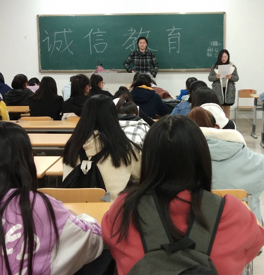 班会首先由班主任宣讲此次班会的主题内容、目的以及诚信的重要性。会议重点强调了学术诚信、经济诚信、生活诚信、诚信贷款与受助、诚信上网和诚信就业等方面的必要性。接下来,由学习委员组织在坐同学自愿签署“诚信承诺书”。在坐学生承诺在学习、生活等各个方面严格要求自己,诚信做人、诚信处事,使自己成长为一名有诚信的大学生。