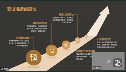 随后,在2024年考研复试中表现出色、成功被心仪院校录取的优秀学生赵珣、焦冠华和刘舒琪作为分享嘉宾,结合自身的复试经历,从不同角度分享了宝贵的经验和心得。赵珣详细介绍了考取中北大学英语语言文学硕士研究生的复试流程,包括笔试、面试两个环节,详细介绍了自我介绍、面试问题及第二外语面试需要做的相关准备,建议同学们早动手准备各个复试环节的内容,避免复试时出现过度紧张或放松情况的发生。焦冠华同学着重分享了天津师范大学英语笔译的复试面试过程及自己所做的各项准备,包括如何准备英语听力和英汉互译的笔试,如何准备和练习自我介绍、视译和专业问题,如何进行模拟面试,她还强调了考研成绩公布前准备工作的重要性及面试时妆容、着装等不同方面的注意事项。刘舒琪同学分享了哈尔滨师范大学学科教学(英语)的复试准备经验及面试经历,建议同学们提前通过报考学校官网了解复试形式,特别是熟悉面试的各个环节,除自己整理相关专业课笔记和材料外,还应积极与其他考研同学组建面试小组,开展模拟面试,相互指导自我介绍、试讲及相关专业知识提问等。