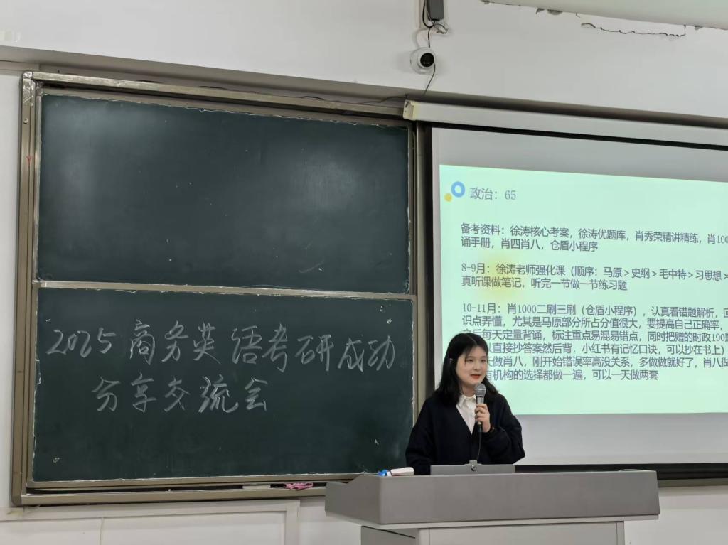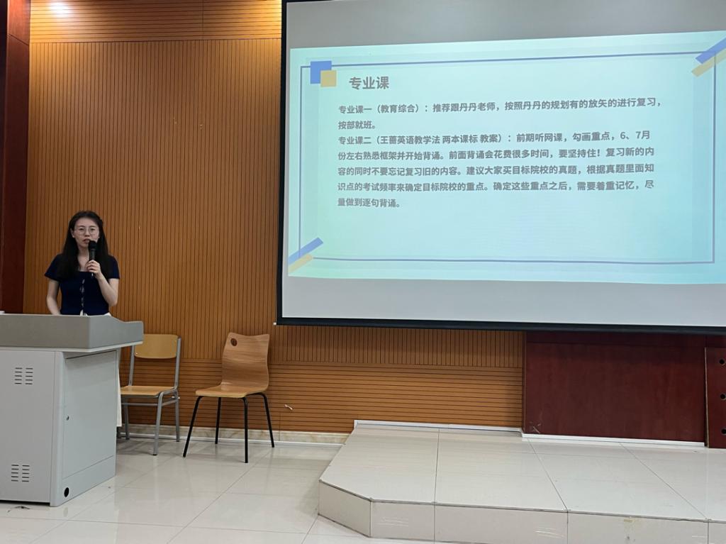 5月8日,商务英语系组织考研专场交流会,邀请了考取天津财经大学英语笔译专业硕士研究生的潘颖同学、考取江苏师范大学学科教学(英语)专业硕士研究生的石佳琦同学和考取中国民航大学英语笔译专业硕士研究生的曹宏宇同学依次做经验分享。三位同学从择校、备考策略、时间管理、作息等多个方面进行了分享,并推荐了一些有用的公众号和学习资源,强调了科学规划考研和提升备考效能的重要性。