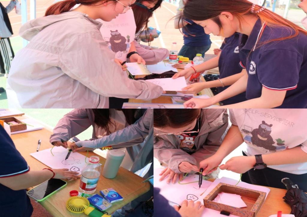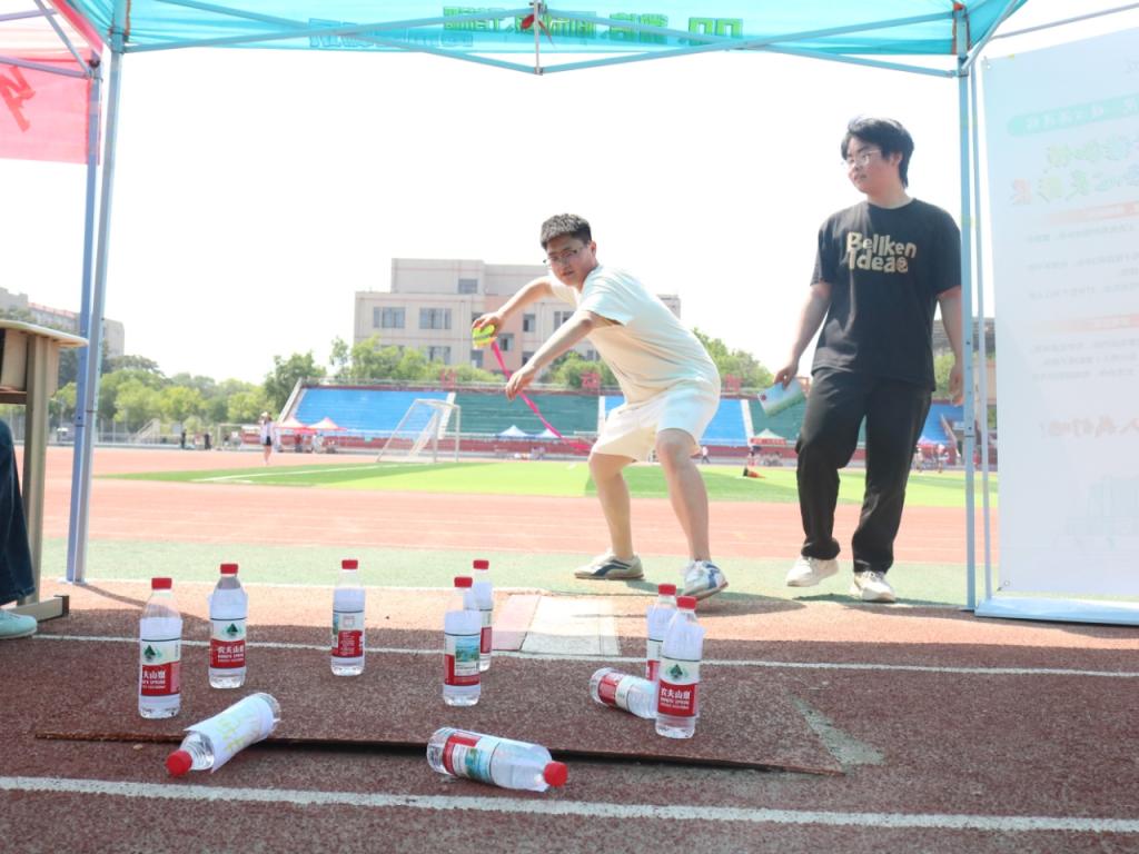 趣味活动围绕情绪管理和团队协作的主题展开。在“击破情绪,拥抱阳光”环节中,同学们将写有“焦虑”“迷茫”等负面情绪的标签的瓶子,用沙包击倒,直观感受压力释放的过程。同学们还主动创新活动玩法,如改变瓶子的摆放位置,把沙包当作保龄球,一击砸中多个,为游戏增添了新的活力。而在“神笔马良,妙笔生花”环节,则要求同学们抽取画画任务后,通过绳子末端控制笔,在三分钟内两人共同完成抽取内容,通过绳子控制笔的难度,让大家意识到沟通与合作的重要性,每一次笔尖的移动都需要队友间的默契与信任。此外还准备了活动小奖品,现场气氛活跃,同学们在趣味活动中获得了身心的放松。