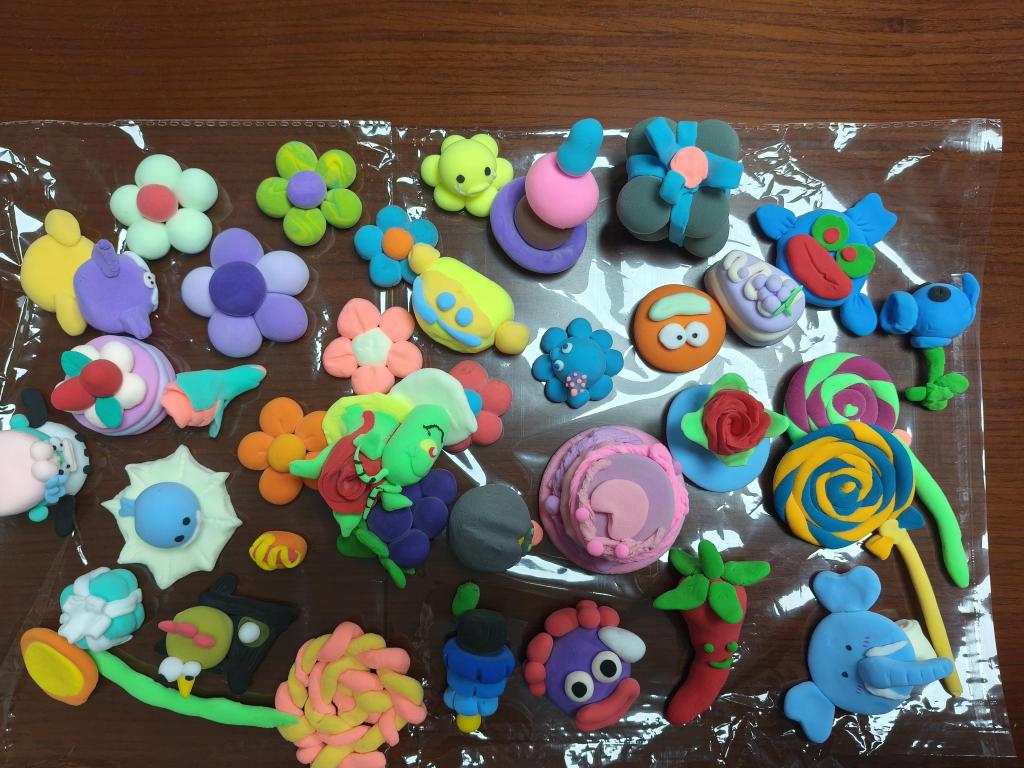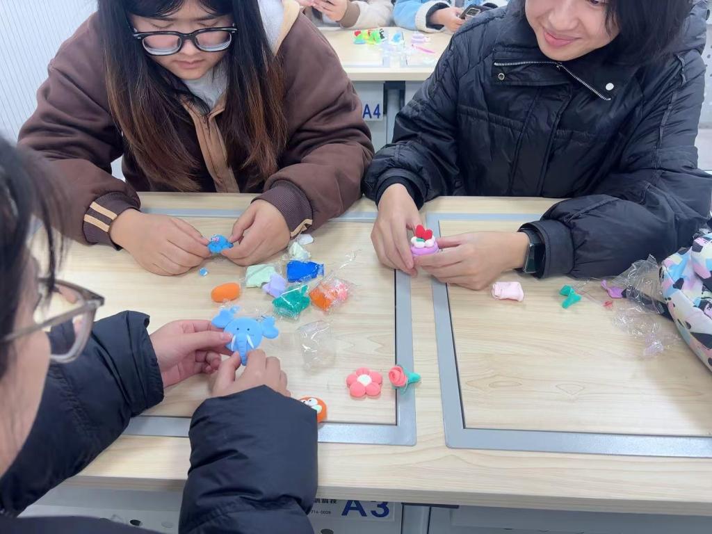 活动伊始,主持人简要介绍了太空泥的特性和使用技巧,鼓励同学们在创作过程中自由表达,放松身心。随后,同学们迅速投入创作,或独立构思,或小组合作,全神贯注地捏塑形态各异的作品,创作出憨态可掬的卡通形象、精致小巧的动植物、富有象征意义的抽象图案等作品,每件作品都承载着独特情感与创作灵感。创作过程中,同学们互相交流创作想法,通过揉捏、塑形释放压力,将情绪融入作品之中。