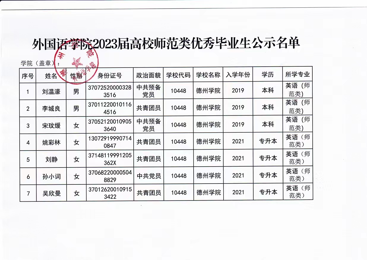 学院根据《山东省教育厅关于做好 2023 届高校师范类优秀毕业生评选工作的通知》文件要求,结合评选条件,本着公平公正公开的原则,经个人申请、综合测评和民主评议基础上,现将2023届高校师范类优秀毕业生名单公示如下:
