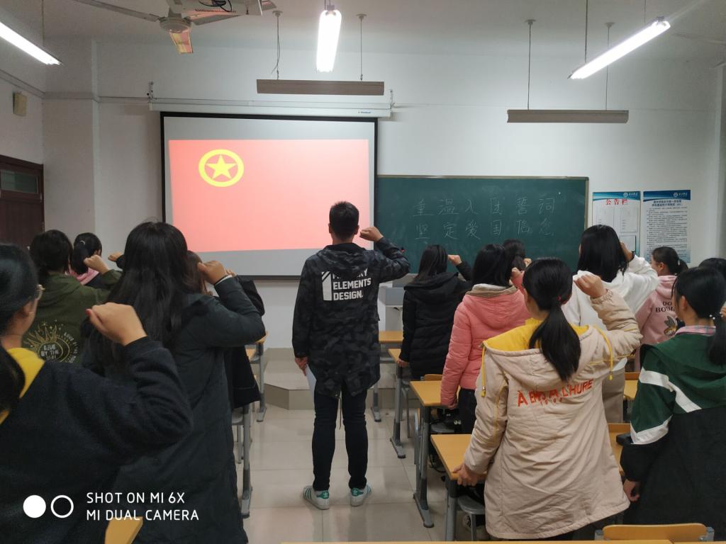活动由各班团支书主持,全体起立,奏唱国歌后,由团支书领誓,重温入团誓词。而后,由团支书宣读《团章》中有关团员的权利与义务的条款,并领学《中国共产主义青年团团旗、团徽、团歌制作使用管理规定》。全体起立奏唱国歌后观看爱国视频,各团员相互交流感受体会。