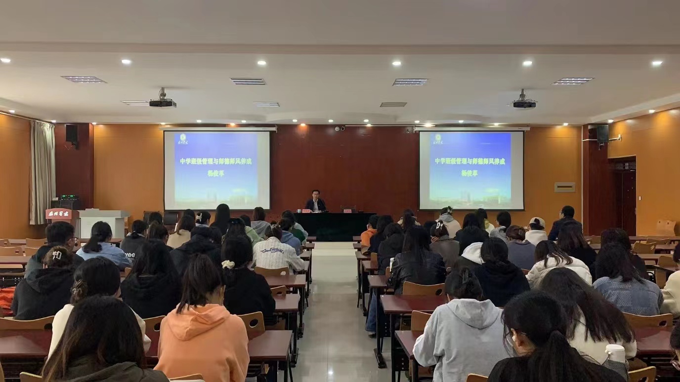 杨俊革校长从“修师德,强师能,铸师魄”三个方面阐释了作为师范生应如何着眼未来涵养师德,树立教书育人理念,为未来的职业发展奠定基础,强调新时代教师要以理想信念为精神之“钙”,以道德情操为价值“航标”,以扎实学识为立身之本,做“四有”好老师。杨校长结合个人教师职业发展历程以及基础教育一线教学管理经验,通过生动典型的教育教学工作案例和书籍的分享,分析了班级管理者的基本素养和技能。