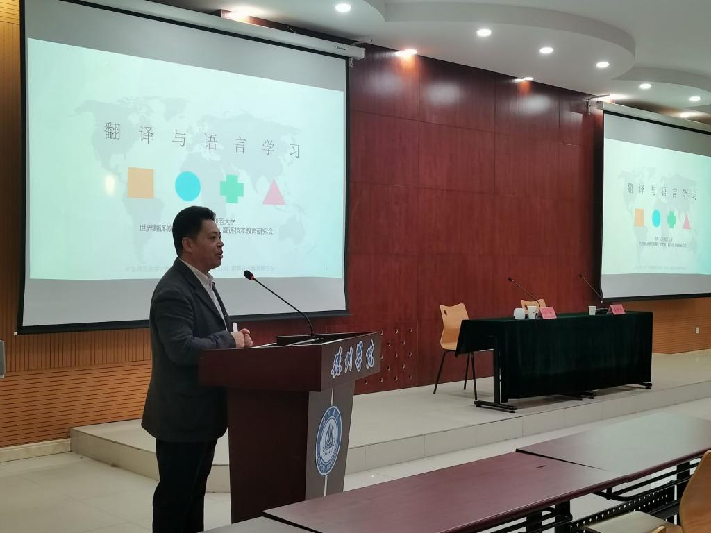 11月13日下午,山东师范大学翻译硕士中心主任徐彬教授来抖音tv电视版app最新开展“翻译与语言学习”专题讲座。本次讲座由抖音tv电视版app最新副院长崔静静主持,学院百余名师生聆听了讲座。
