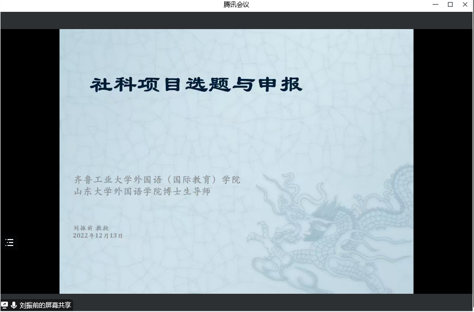 刘振前教授围绕科学研究三要素、课题选择的原则与课题来源、影响课题选择的因素、课题完善方法、文献的搜索与综述、社科项目申报误区等方面系统地阐述了社科项目申报的重点难点和申报要领,提出科研中要有问题意识、理论建构、研究方法等,并分享了社科基金申报的诸多经验,为老师们社科项目的选题、设计及申报书的撰写提出了指导性意见和建议。