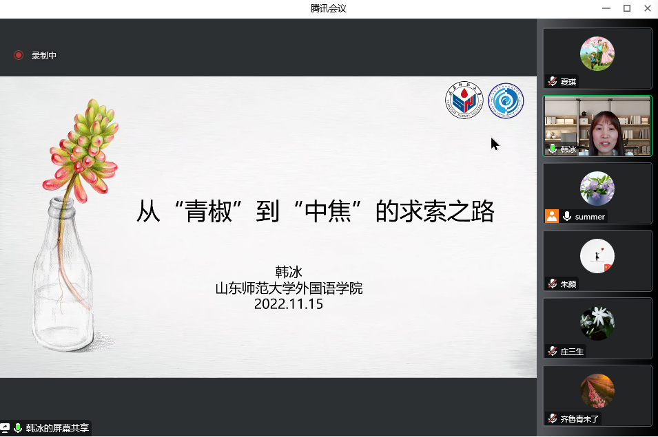 11月15日下午,抖音tv电视版app最新邀请山东师范大学抖音tv电视版app最新硕士生导师韩冰副教授在线进行学术交流,作题为“从‘青椒’到‘中焦’的求索之路”的学术报告。